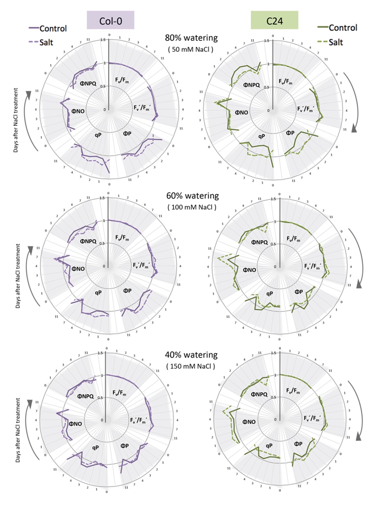 應用FluorCam葉綠素熒光技術,對野外植物進行原位不同季節長期監測,同時監測植物光合作用(CO2同化)A,結果參見下圖。FluorCam葉綠素熒光技術采用激發光脈沖調制技術、高靈敏度CCD傳感器(采樣頻率達每秒50次)技術及智能LED光源,可以大面積(標配每幀成像面積35x35cm)植物/作物成像分析,在野外既可在夜間進行暗適應條件下的葉綠素熒光成像分析,還可在環境光適應條件下進行葉綠素熒光成像分析,比簡單的激光誘導葉綠素熒光測量(通過一束點狀或線型單色激發光源激發葉綠素熒光并進行測量,優點是省電且可以更輕便)相比有諸多功能優勢,不僅測量參數多、可以進行各種葉綠素熒光實驗程序成像測量分析,而且一次二維成像(真正的成像分析)避免了點狀或線型激發光掃描造成的葉綠素熒光測量不同步、野外風吹草動分辨率嚴重降低等問題。