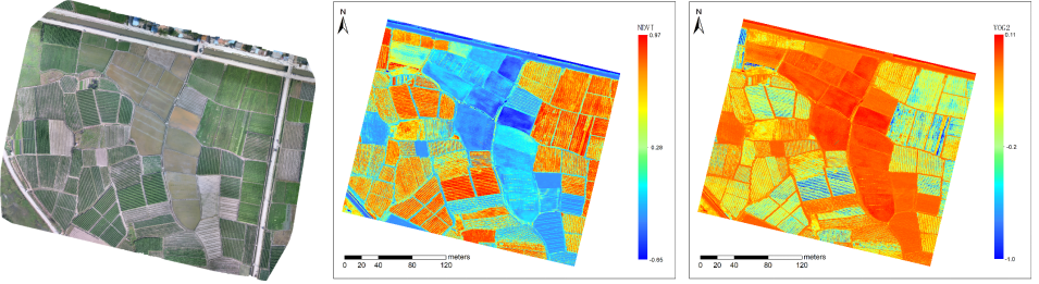上圖依次為RGB通道合成、NDVI、VOG2,可以看出試驗區剛插秧的水稻田整體NDVI遠遠低于周邊農田,而紅邊指數VOG2則正好相反,驗證了其對表達葉綠素含量、冠層和水含量的綜合作用的敏感程度