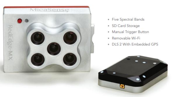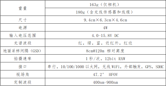5波段多光譜鏡頭,涵蓋蘭、綠、紅、紅邊、近紅外五波段多光譜成像,每像素8cm@120m高度,圖像獲取速率為每秒1次全部5個波段,12比特RAW,視角47.2°,SD卡存儲帶地理標簽的多光譜圖像