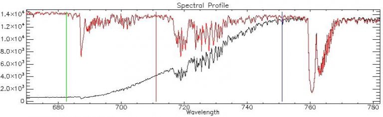AisaIBIS采用“夫瑯和費線深度法”測量太陽輻射誘導的熒光。該方法在670 – 780 nm的特定光譜區域內,可對兩條吸氧譜線底部的微弱熒光信號進行檢測和定量。并結合Specim公司的高光通量(F/1.7)成像光譜儀和新穎的sCMOS成像技術,可在飛行條件下以較高的成像速率和優異的光譜采樣間隔(0.11 nm)采集高質量、低噪聲、高動態范圍和信噪比的高光譜數據。