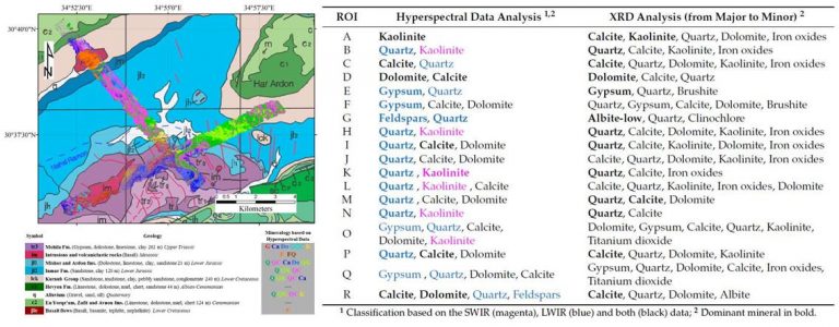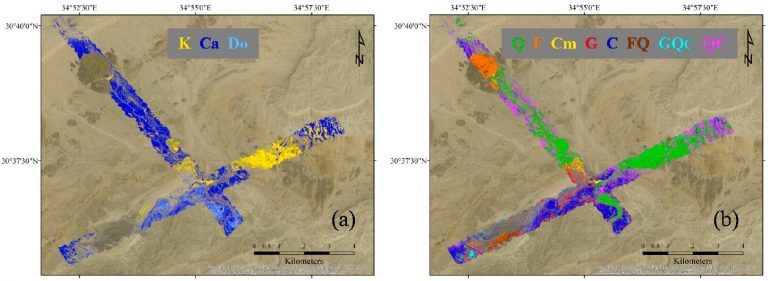 (2)以拉蒙馬赫塔什地表礦物分類研究為例,下圖由兩條航線覆蓋,使用FENIX采集SWIR數據(圖a),使用OWL采集LWIR數據(圖b),通過光譜分析得出以下結果。