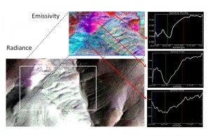 (1)右圖為美國內華達州赤銅礦的飛行數據樣例。由輻射數據得到的8至12μm的光譜發射率,用目標區域3個不同地點的光譜曲線舉例說明該區域不同礦物質分布情況。如果只用VNIR/SWIR高光譜數據分析,可能并不能明顯區分礦物,如石英、長石和玉髓,可結合LWIR高光譜數據進行精準識別。