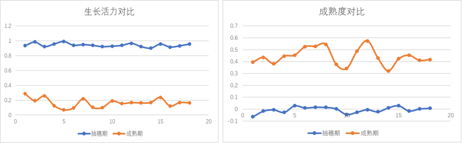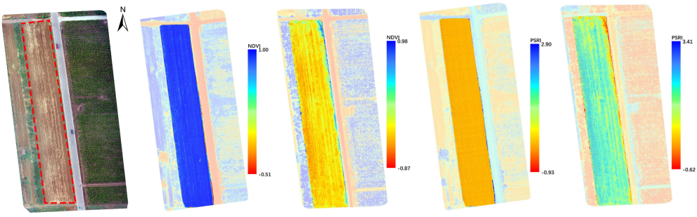 冬小麥生長后期漲勢評估:下圖依次為RGB圖、抽穗期NDVI圖及PSRI圖、成熟期NDVI圖及PSRI圖,通過提取反射光譜指數,反映了小麥自抽穗后到成熟期,其營養生長基本停止,生長活力明顯降低,成熟度大幅增高,即將進入收割階段。