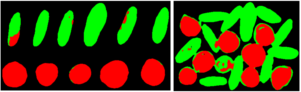 上圖中為運用SpectraScan-FX高光譜成像技術對黃芪和甘草的分類鑒定結果(紅色為甘草、綠色為黃芪),左圖為兩種飲片分類規則擺放,右圖為隨機混合擺放