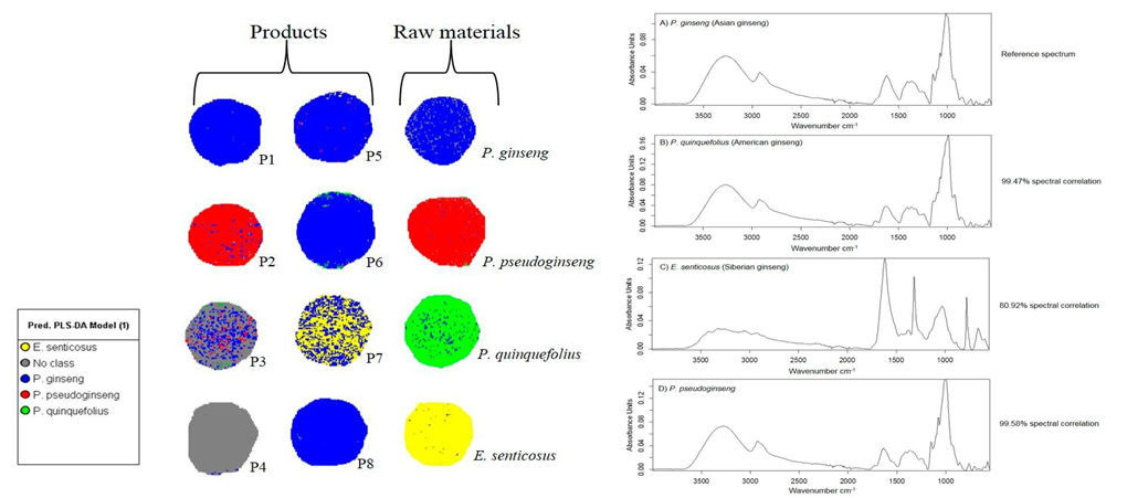 左上圖為基于高光譜成像數據的商業產品和真實參考材料(測試集)的PLS-DA鑒定結果;右上圖為不同人參種類與人參內部參考物質的光譜相關性,A)人參、B)西洋參、C)西伯利亞人參、D)假人參。