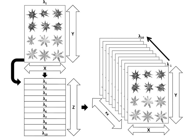 上圖為創建三維超立方體的示意圖。空間尺寸用X和Y表示,光譜尺寸用Z表示。在此示例中,尺寸X和Y的圖像是在10個不同的波長(>1-10)下采集的,并按順序堆疊以形成超立方體。