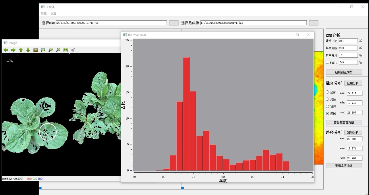 冠層溫度是測量監測土壤水分狀態、做完健康狀態及水分和鹽分脅迫的重要指標。一般的冠層溫度測量監測會受到土壤等“非冠層”部分的影響和冠層陰影部分的影響,只有太陽光照射到的冠層部分才能反映真實的水分脅迫狀況。Thermo-RGB成像技術將紅外熱成像與可見光成像融合分析,以區分土壤、陽光照射葉片和陰影葉片的覆蓋度和溫度情況(最高溫度、最低溫度、平均溫度),并可進行ROI選區分析、顏色分析、溫度頻率直方圖及溫度線性分析等