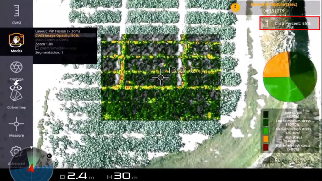 在旱季,人們通常感興趣的是干旱對作物的實際影響。這些影響不僅取決于所謂的氣候干旱條件,而且還取決于地下水干旱、植物根系的大小等。利用WIRIS Agro測量植物的水分脅迫將有助于用戶確定干旱對作物的實際影響,如下圖所示,田間作物CWSI值普遍在0.5一下,說明整體干旱程度較低。