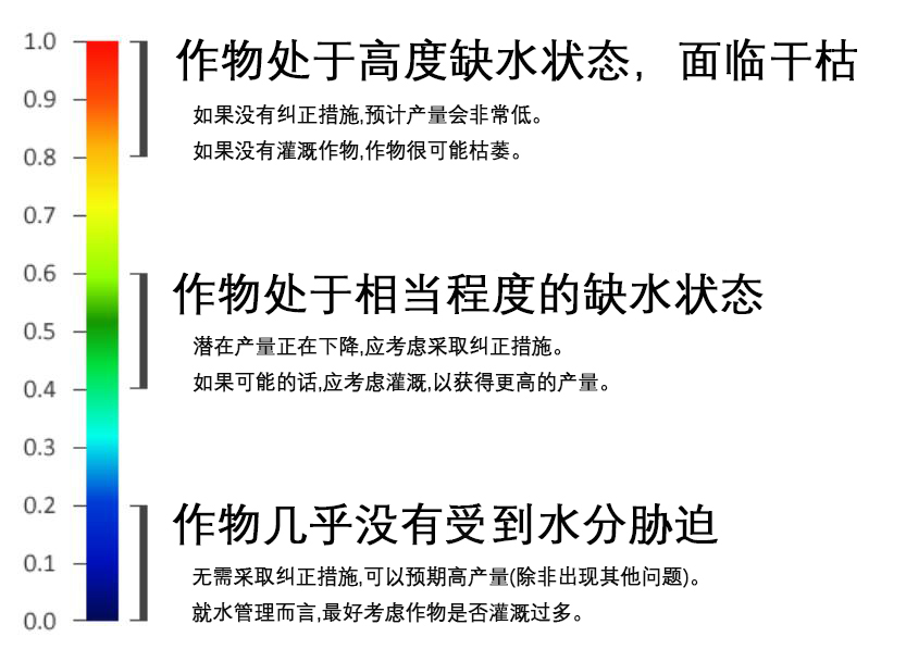 Agro相機技術基于作物水分脅迫指數(歸一化值為0到1),提供了關于大面積作物脅迫和作物水分管理的信息。這些信息可用于確定產量圖、管理灌溉或執行與水管理有關的補救措施。 |