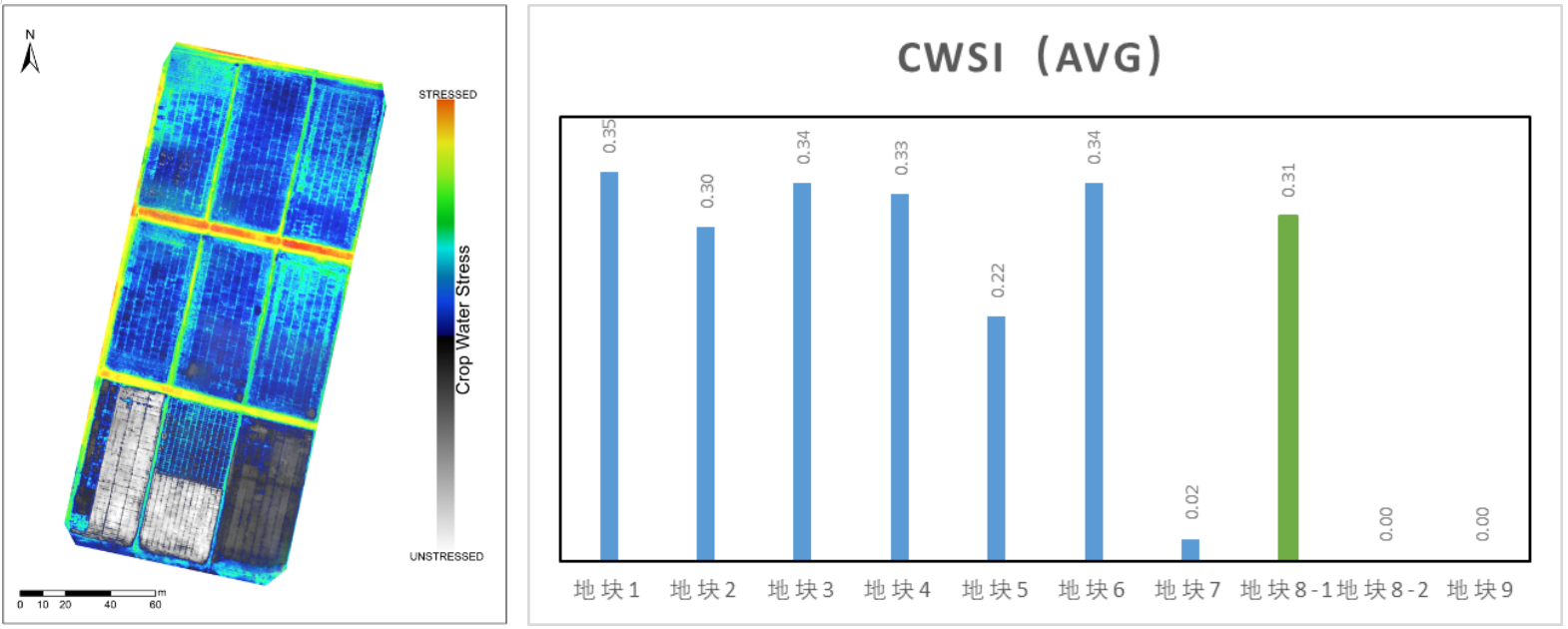通過RGB影像,玉米的干旱脅迫地塊1至6和正常地塊7并沒有明顯差異,但在CWSI圖中,干旱脅迫地塊CWSI指數值平均為0.31,遠遠高于正常地塊0.02。而大豆的干旱脅迫地塊8-1平均值0.31明顯高于正常地塊8-2和9的平均值0。通過CWSI值也反映出,整體來說干旱脅迫地塊1至6及8-1雖然受一定程度脅迫,但水分脅迫等級相對較低,正常地塊7、8-2、9水分充足,基本未反映出脅迫,與實際情況相符。
