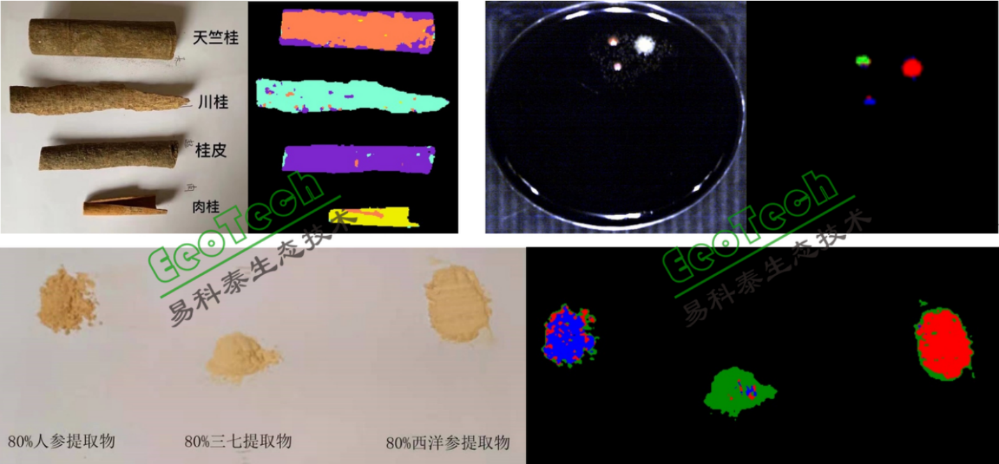 上左圖:不同來源桂皮檢測;上右圖:幽門螺旋桿菌檢測。下圖:人參西洋參檢測(上述實驗檢測結果皆由易科泰光譜成像創新應用研究室提供)