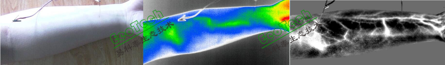熒光示蹤法展示的是熒光劑的擴散遷移路徑,跟手臂心包經的高度吻合是否意味著經絡的存在?易科泰生態技術公司光譜成像創新應用研究室(SpectrAPP)和上海中醫藥大學合作,采用非損傷光譜成像技術,對針灸狀態下手臂心包經進行了光譜成像動態分析,展示了直接的光譜信息(而不是熒光劑等間接影像信息)包括皮下靜脈血管信息: