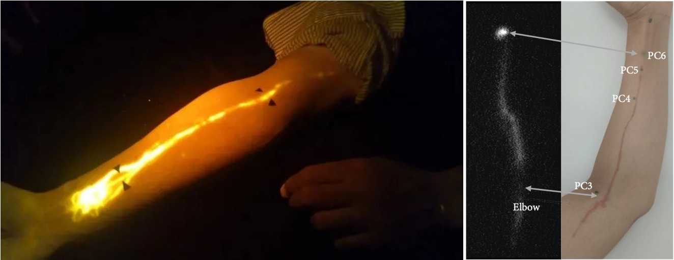 新奧集團生命科技研究院及中國中醫科學院研究人員,采用熒光示蹤技術,通過內關穴位注射熒光素鈉和吲哚菁綠,發現熒光劑沿手臂的擴散軌跡正好與心包經相吻合,在國內引起熱議,被認為是“中醫經絡存在證據”、“中醫經絡被發現”。該研究成果發表于2021年4月份 《循證補充和替代醫學》(Tongju Li etc. 2021. In Vivo Visualization of the Pericardium Meridian with Fluorescent Dyes. Evidence-based Complementary and Alternative Medicine)