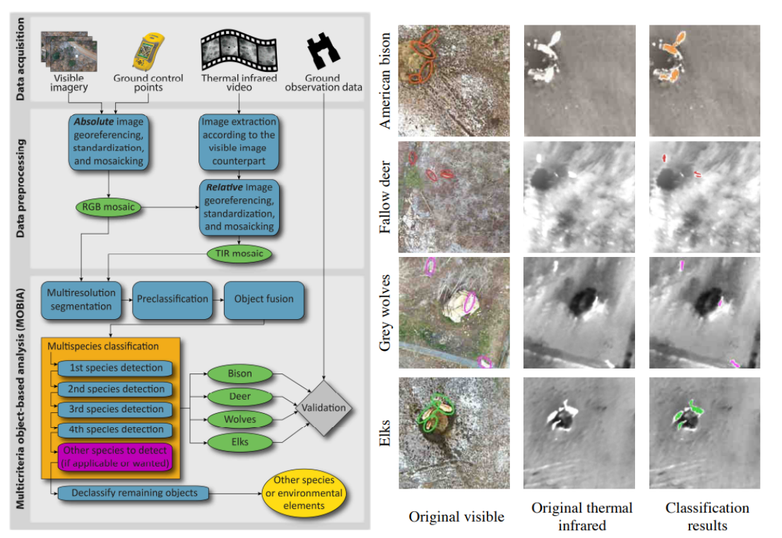 右圖:目標動物的無人機遙感可見光、熱成像和分類結果圖。