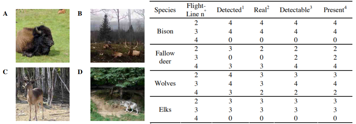 左圖:調查目標物種A美洲野牛、B麋鹿、C黇鹿和D灰狼