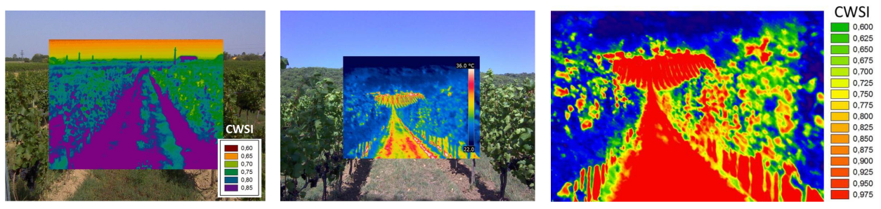 左圖:中-高水分脅迫水平下的葡萄行CWSI;中、右圖:葡萄園地塊的可見+紅外融合及CWSI圖
