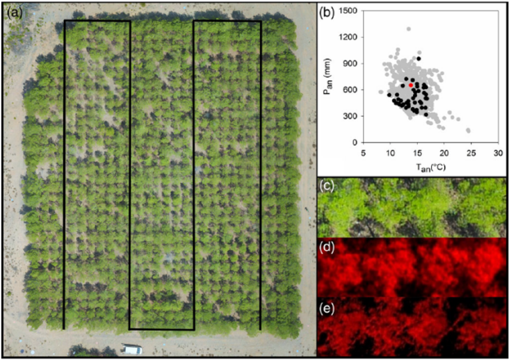 圖1:阿勒頗松遺傳試驗的航拍圖像以及56個種群的主要特征;(a)正射圖及航線,(b)歐洲森林遺傳資源計劃中所有的阿勒頗松所在地點(灰點)、56個種群取樣區域(黑點)及試驗地點(紅點)的平均年降水量和溫度,(c~e)一個試驗單元的正攝圖、假彩色圖和去除背景的假彩色圖