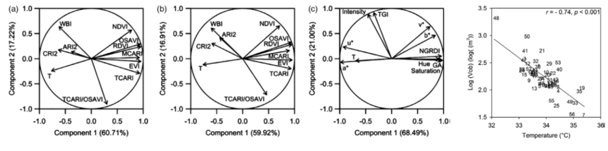 左圖:多光譜指數(a)、僅在植被區域測量的多光譜指數(b)、RGB 衍生指數(c)及冠層溫度(T)的主成分分量載荷分布;右圖:植被冠層溫度和樹干材積(對數轉換)之間的相關性