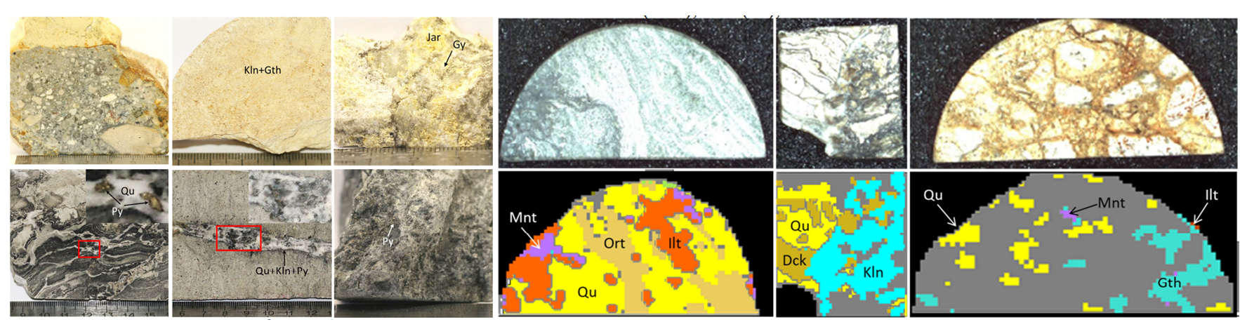 Polymetal公司工程科學與冶金學博士Ilya Anisimov等人使用SWIR和LWIR波段高光譜相機對該礦床樣品進行紅外高光譜圖像掃描。并根據礦物的光譜特征,對樣品圖像進行主成分分析和回歸分析。區分了石英(Qu);針鐵礦(Cth);長石,包括正長石(Ort)、微斜長石;粘土礦物,包括高嶺石(Kaol)、地開石(Dk)、蒙脫石(Mnt)、伊利石(Ilt)、白云母。