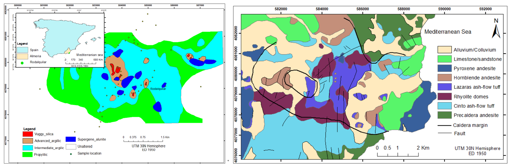 根據SWIR-LWIR結合分析結果,該巖石樣品被劃分為蝕變帶,將巖石樣品的蝕變帶與現有礦物圖進行比較發現,在該樣品中存在硅酸鹽、頁硅酸鹽、硫酸鹽和碳酸鹽礦物。還分析得出了 Rodalquilar 高硫化型淺成低溫熱液系統中硅化和晚期泥質帶的精細分布并繪制礦物圖。該方法為礦石礦化研究提供了指引,并改進了西班牙東南部 Rodalquilar 低溫熱液系統現有的蝕變帶圖。