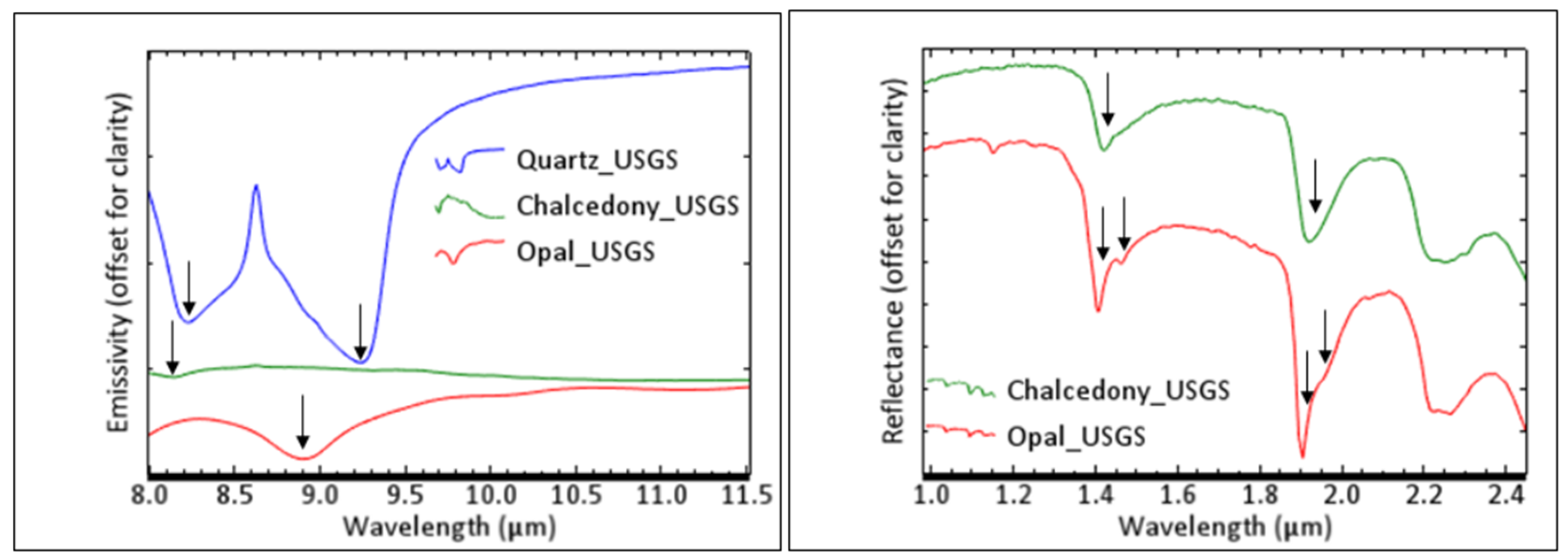 圖1-4:晚期泥質帶在LWIR和SWIR波長范圍內的發射率和反射光譜。箭頭表示LWIR發射率最小特征和SWIR吸收特征