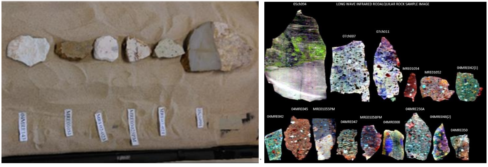 圖1-2:準備進行高光譜數據采集的巖石樣品。置于裝滿沙子的木箱上的樣品(左);LWIR成像偽彩色圖(右)