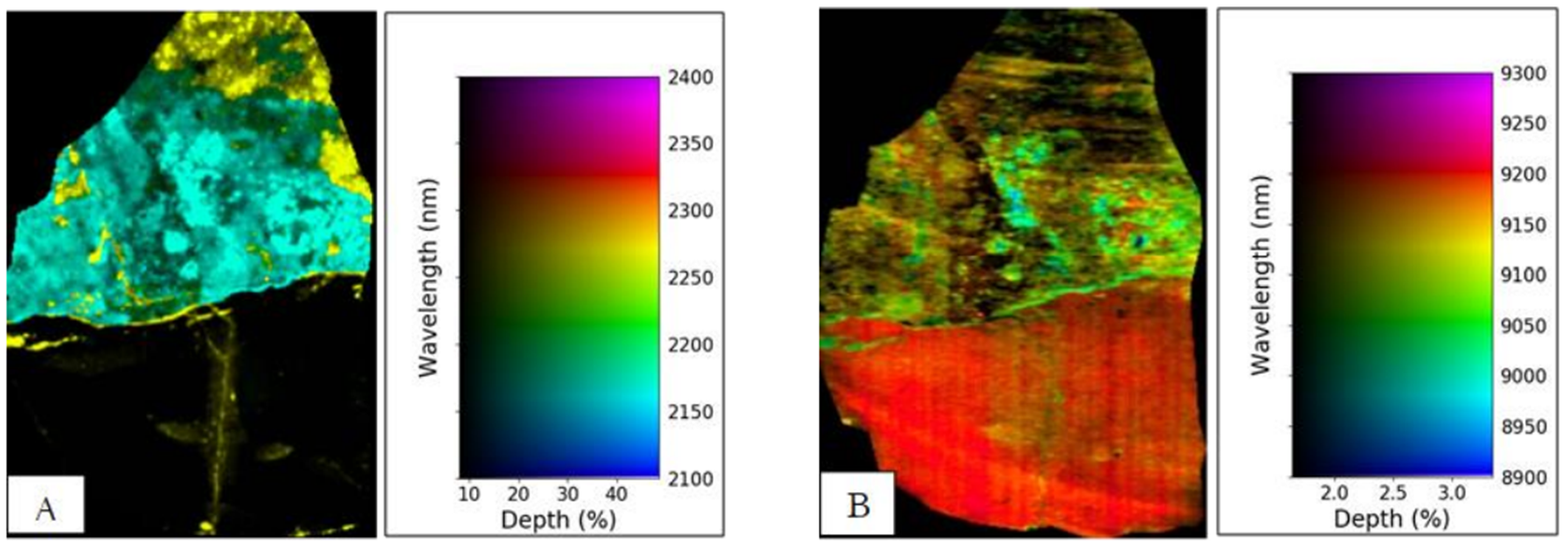 圖1-4:樣品05ch094分別在SWIR和LWIR波段表達的礦物分布圖。 A) 2267nm指示的黃色區域代表黃鉀鐵礬,2170nm指示的青色區域代表明礬石; B) 8969nm指示的青色區域代表明礬石,9018nm指示的偏綠色區域代表黃鉀鐵礬,其他顏色則為石英和明礬石的混合物。A)圖中黑色代表石英,對應B)圖中9200nm指示的紅色區域