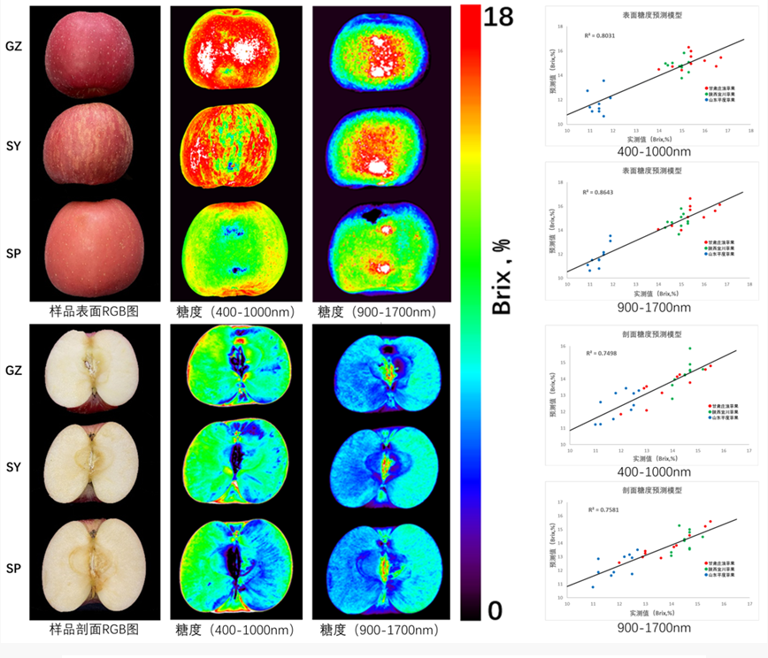 易科泰光譜成像實驗室技術人員,使用PhenoTron?-HSI果實品質高光譜無損檢測技術(400-1700nm),分別對產自甘肅莊浪(GZ)、陜西宜川(SY)、山東平度(SP)三個不同產地的2021年秋季采摘的紅富士蘋果進行光譜成像分析,并分別選取三種樣品表面及剖面各10個區域實測糖度,建立預測模型評估糖度分布。