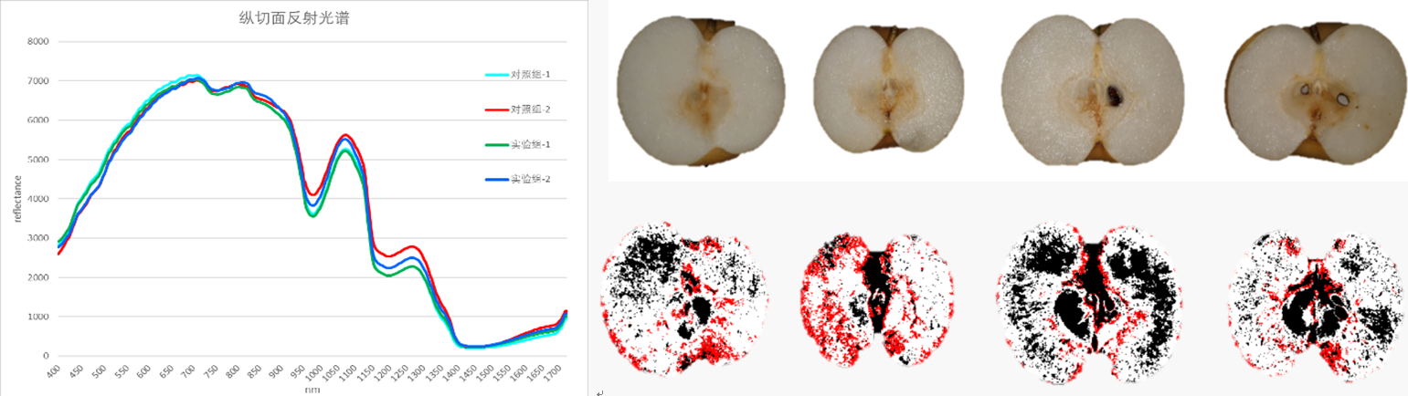 秋月梨剖面光譜特征及石細胞(紅色)分布(易科泰光譜成像實驗室供圖)