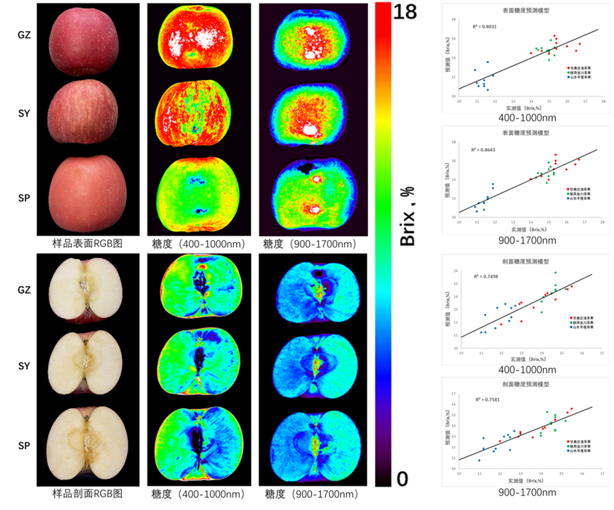 不同產地紅富士蘋果表面及剖面糖度分布(易科泰光譜成像實驗室供圖)