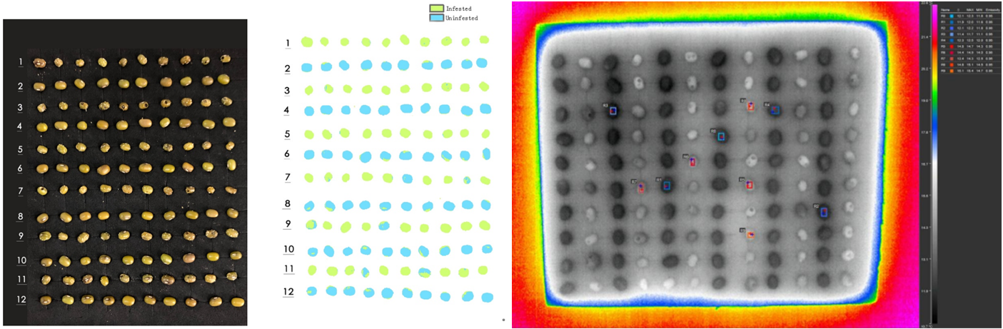 豆象侵染綠豆種子的光譜成像:900-1700nm高光譜成像分析(左圖);紅外熱成像圖(右圖)