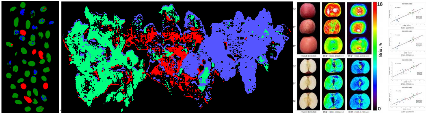 由左到右依次為花生霉變分撿、肉品分揀(豬肉、牛肉、羊肉)、蘋果糖度檢測(易科泰光譜成像實驗室提供)