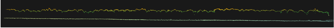 上左圖:激光雷達與RGB圖像融合側視圖;上右圖:人工松樹林高度渲染;下圖:人工松林剖面高度