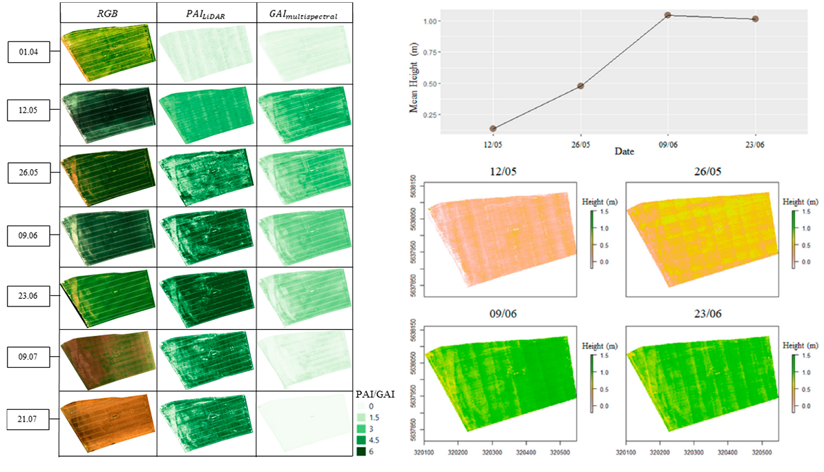 研究結果表明,在冬小麥成熟之前的生長階段中,基于Lidar數據衍生的植物面積指數(PAI)與通過地面設備采集的綠色面積指數(GAI)值具有高度一致性,與多光譜成像獲取的GAI估計值也密切相關,可準確反映冬小麥生長過程中在空間結構上的變化。通過每個采集時段(12/05、26/05、09/06、23/06)點云數據創建的數字地表模型DSM減去數字地形模型DTM(01/04,生長季節開始時),也能對冬小麥高度進行有效估算。同時,使用多光譜數據補償Lidar PAI,可以區分綠色植被面積指數與非綠色植被面積指數,在整個作物生長周期互相補充,進行作物建模,以實現精準施肥、作物管理和碳儲存估算等。
