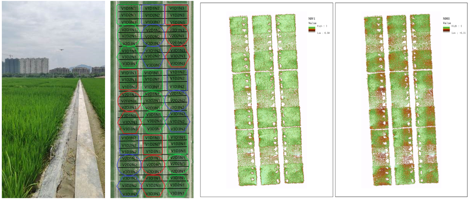 圖1:依次為飛行作業圖;水稻田不同處理方式(品種、種植密度、施肥濃度)標記圖;NDVI圖;NDRE圖