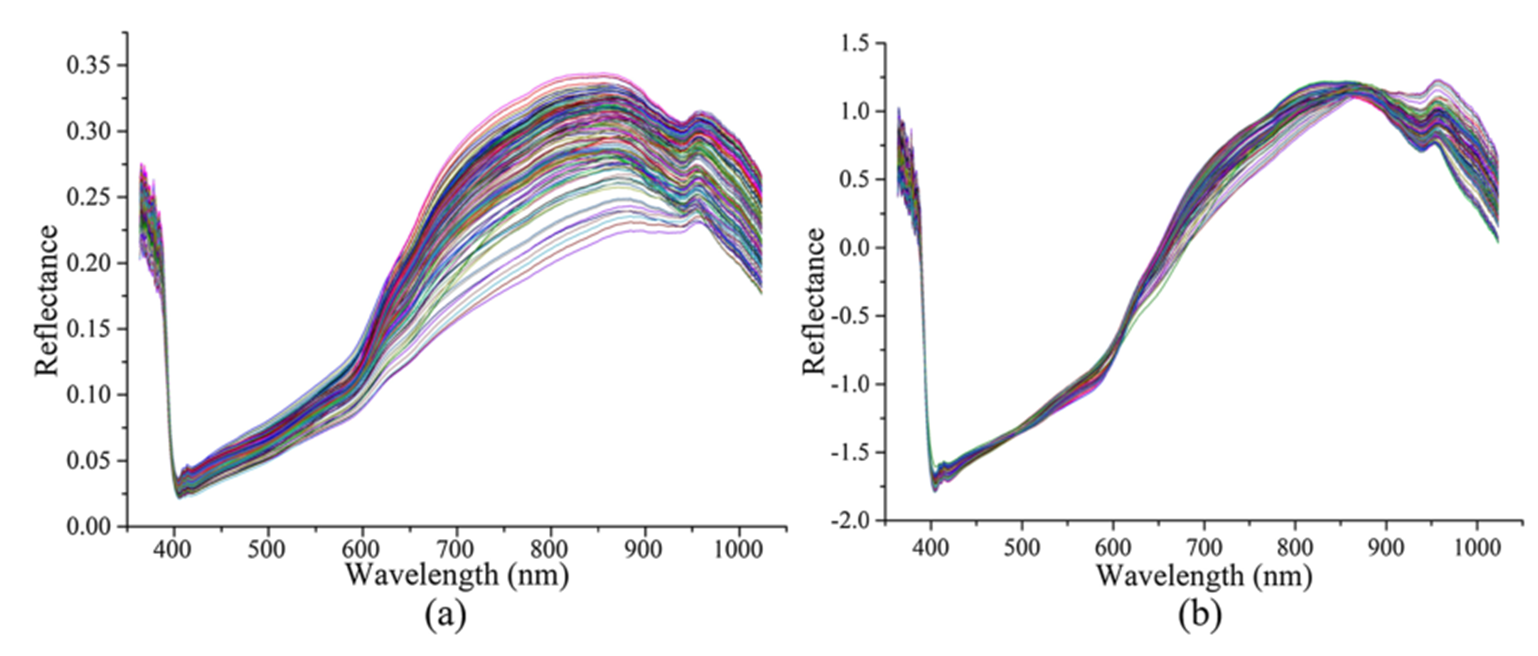 圖1-2:(a) 所有150個花生樣品的原始光譜和(b)SGS+SNV光譜
