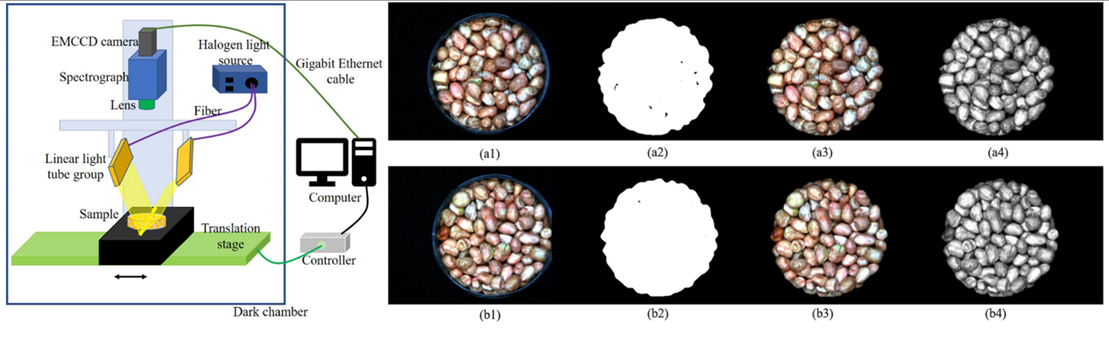 圖1-1:高光譜成像系統示意圖(左);花生樣品RGB及分割處理圖像(右):(a1)- (a4)依次為AFB1含量最小(0.1 ppb)的花生分割前RGB圖像、ROI二值圖像、分割后RGB圖像和分割后灰度圖像;(b1)-(b4)為AFB1含量最高(599.21 ppb)的花生對應圖像