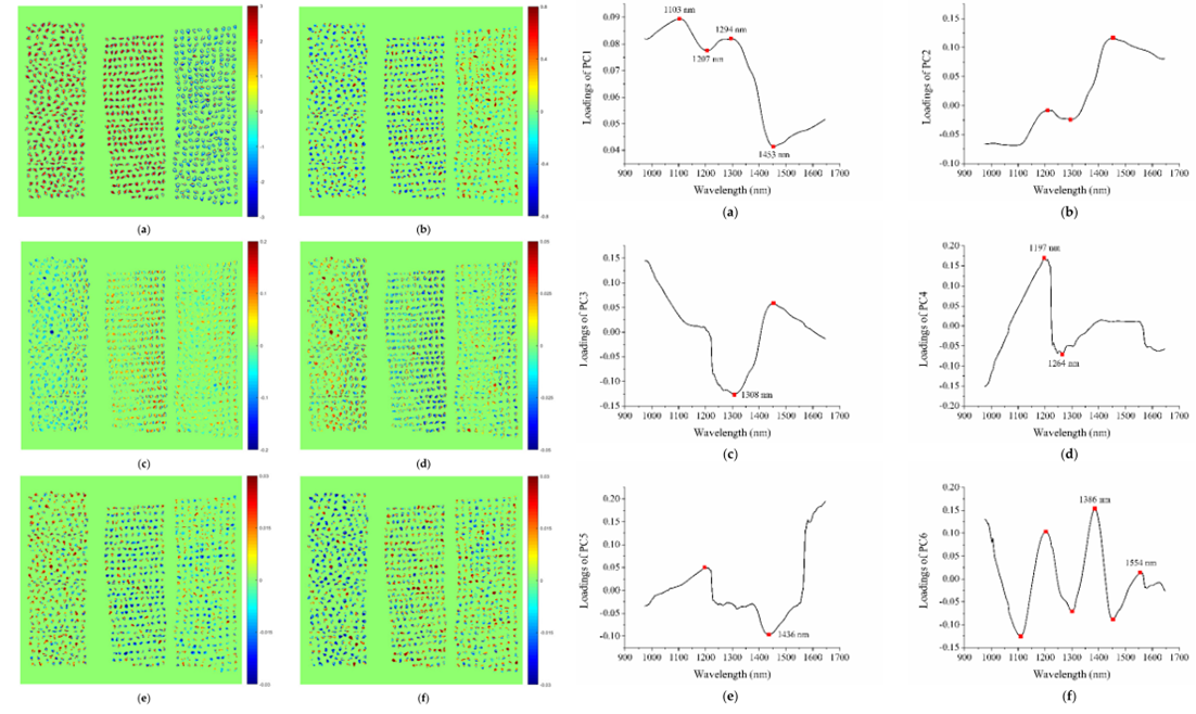 浙江大學生物系統工程與食品科學學院Yong He等研究人員,使用ImSpector N17E光譜儀+ Xeva 992相機組成HSI系統,分別采集了三個葡萄品種的14015、14300和15042顆葡萄種子在874-1734nm光譜范圍內的高光譜圖像。通過小波變換對像素級光譜進行預處理,然后提取每個葡萄籽的光譜。對高光譜圖像進行主成分分析(PCA),使用前六個PCs的分數用于定性識別不同品種之間的模式,前六個PCs的載荷用于識別有效波長(EWs)。