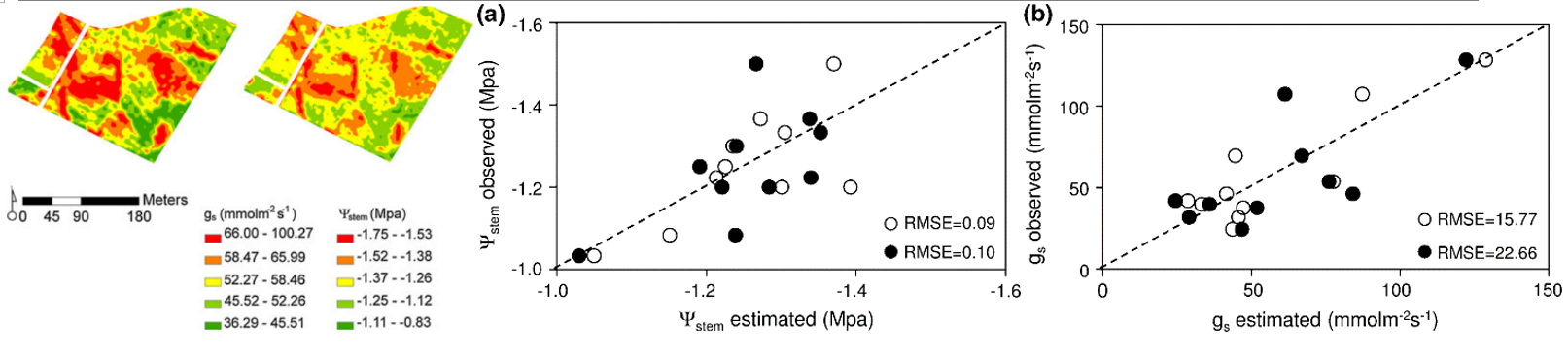 圖1.2 左:通過NDVI獲得的平均水勢和氣孔導度;右:(a)NDVI(白點)和Ig2(黑點)估算的標記莖水勢散點圖,(b)TCARI/OSAVI(白點)和Ig2(黑點)估算的葡萄樹氣孔導度散點圖。采用留一交叉驗證計算了均方根