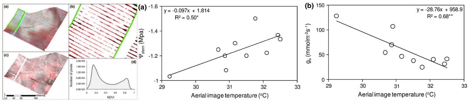 圖1.1 左:(a)10cm分辨率的偽彩色圖,(b)對綠色框選區域基于NDVI直方圖(NDVI>0.75)的分水嶺算法(紅色)的數據提取,(c)全部區域數據提取,(d) (a)中所示整個區域的NDVI直方圖;右:用氣孔導度(a)和莖水勢(b)(n=10)對遙感數據估算的溫度進行線性回歸。其中**在p值<0.01時顯著,*在p值<0.05時顯著