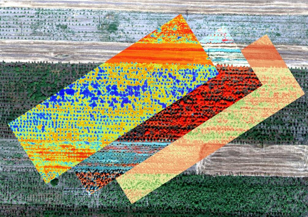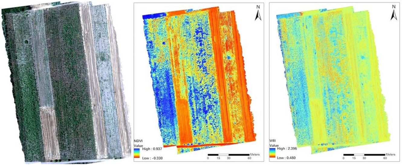 飛行作業采集的不同土地類型(人工林、新造人工林、收割后的麥田)高光譜數據初步處理結果,從左至右依次為RGB影像圖、NDVI植被歸一化指數、WBI水波段指數