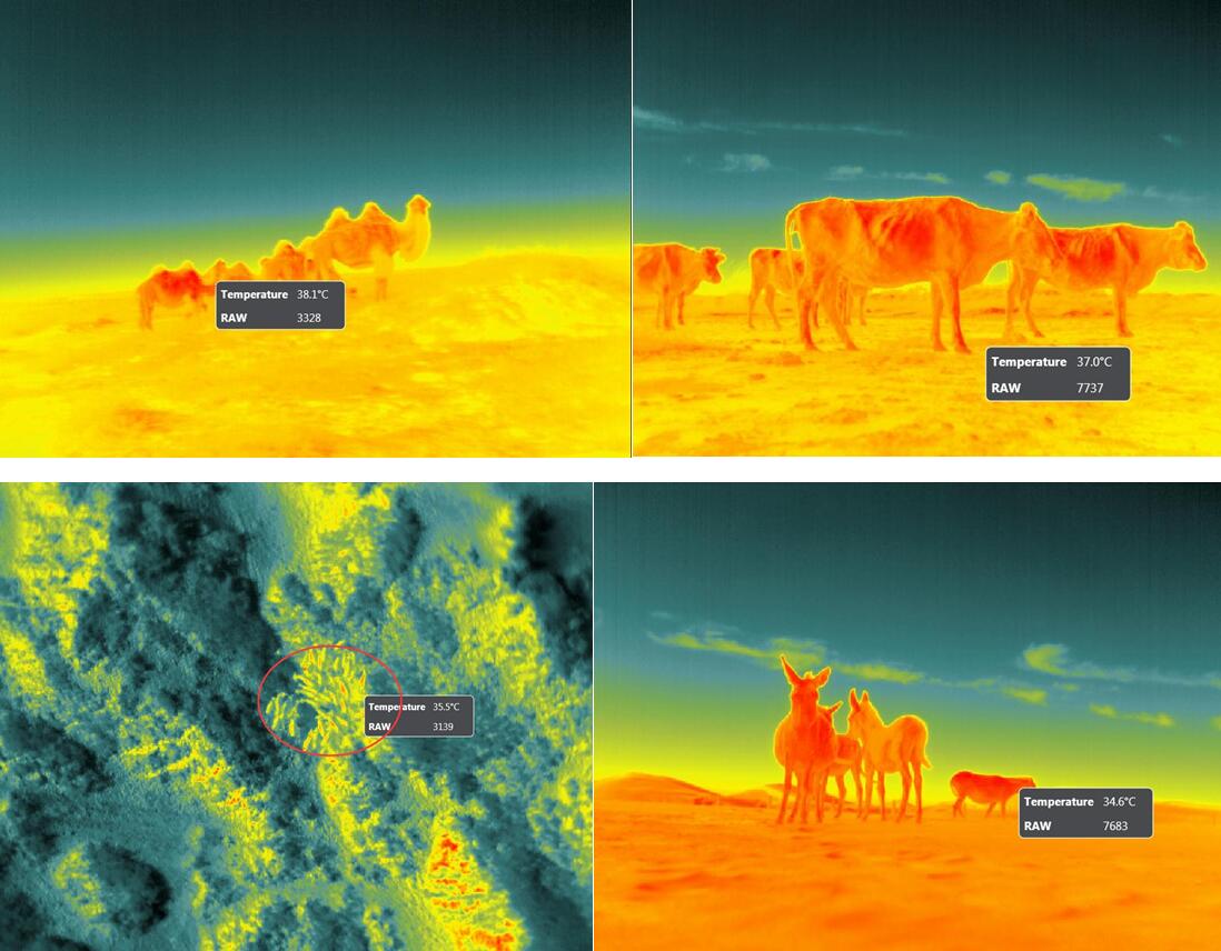 第三階段為動物紅外熱成像技術演示。通過EcoDrone UAS-8搭載紅外相機及手持成像,分別對駱駝、牛、驢、羊等家畜進行紅外熱成像(詳見下圖),通過可視化溫度成像分析,可準確判斷生病或懷孕家畜,輔助飼養人員及時發現并預防。