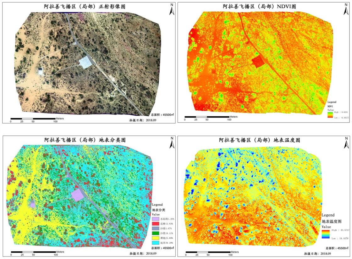 飛行演示結束后,通過在飛播區實際飛行作業采集數據,并對數據進行后處理分析。主要包括多光譜正射影像生成、NDVI提取、植被監督分類、地表溫度圖生成等分析,對飛播區植被進行了快速評估。