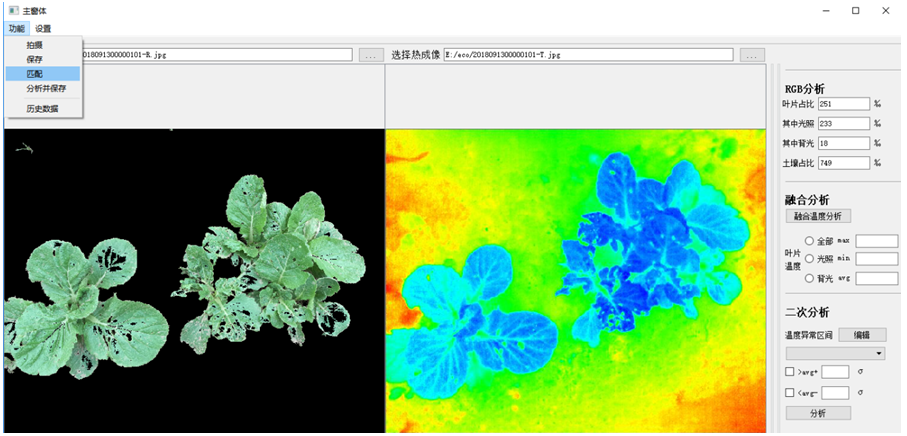 4) Thermo-RGB紅外熱成像與RGB真彩成像融合技術,可測量陽光照射葉片的溫度和覆蓋度等,以精確反映作物氣孔導度動態,使作物冠層溫度測量精準區分陽光照射葉片、陰影葉片及土壤背景,并可進行ROI選區分析、頻率直方圖分析顯示等