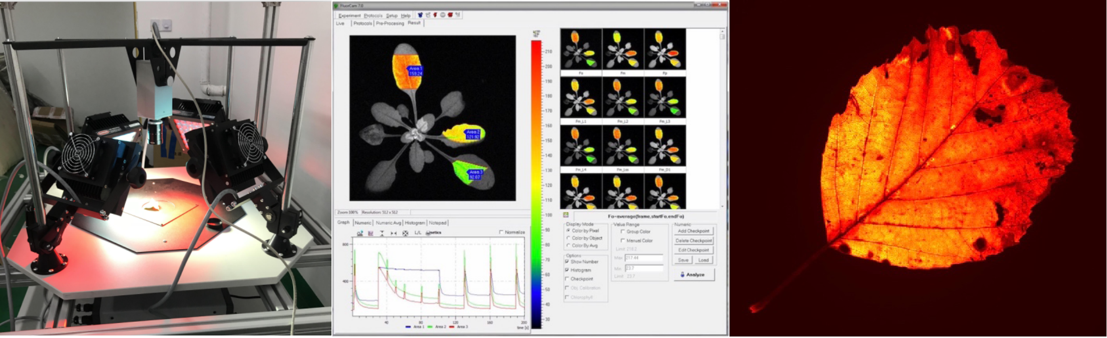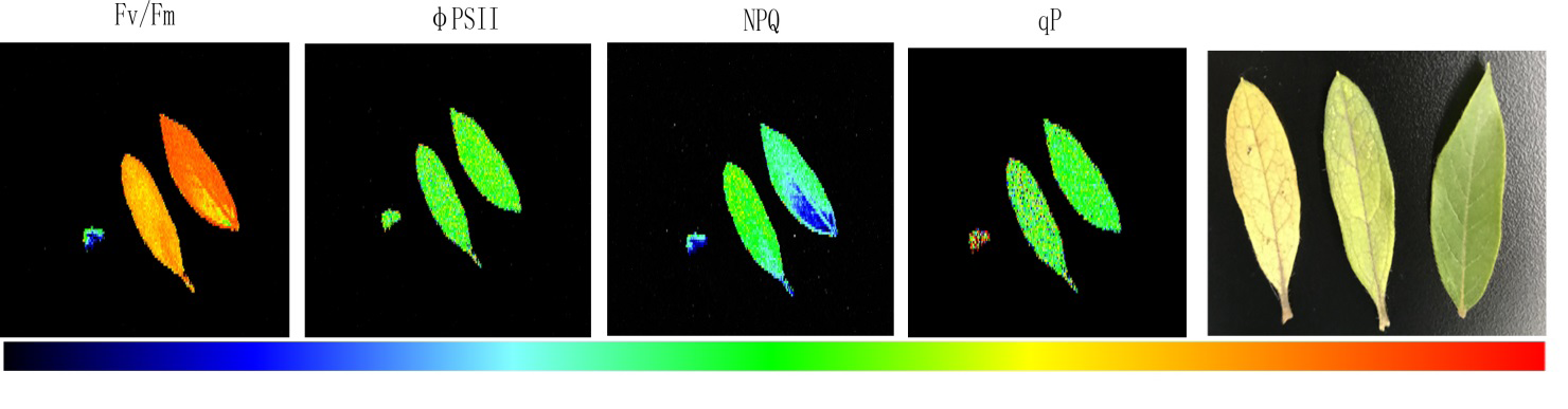 下圖為易科泰工程師與實驗室研究人員安裝運行期間,選取3片不同黃化程度的杜鵑葉片進行的成像分析(自左至右依次為最大光量子產量Fv/Fm成像、有效光量子產量成像、非光化熒光淬滅NPQ成像、光化淬滅成像、RGB成像)。